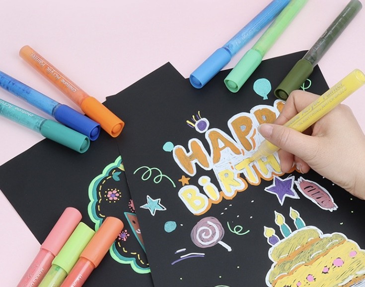 Our acrylic pens have little smell, are environmentally friendly and non-toxic, have upgraded colors, are available in multiple colors, and the color performance is more fresh and rich. The new valve structure, no sponge, effectively prevents ink bursting, is waterproof, light-resistant, and has good covering power on dark surfaces.