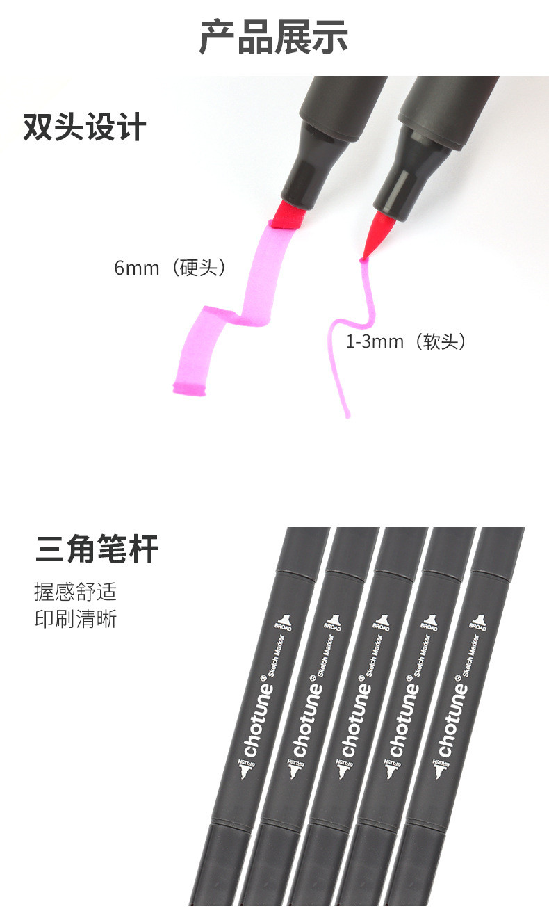 Double-ended design, square tip line width 6-7mm, easy to quickly color, the other end of the small tip easy to describe the details.