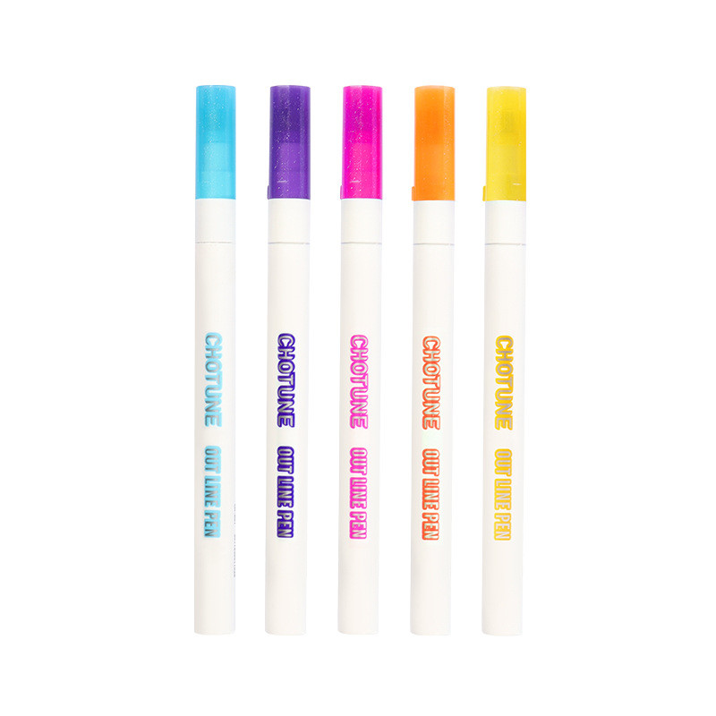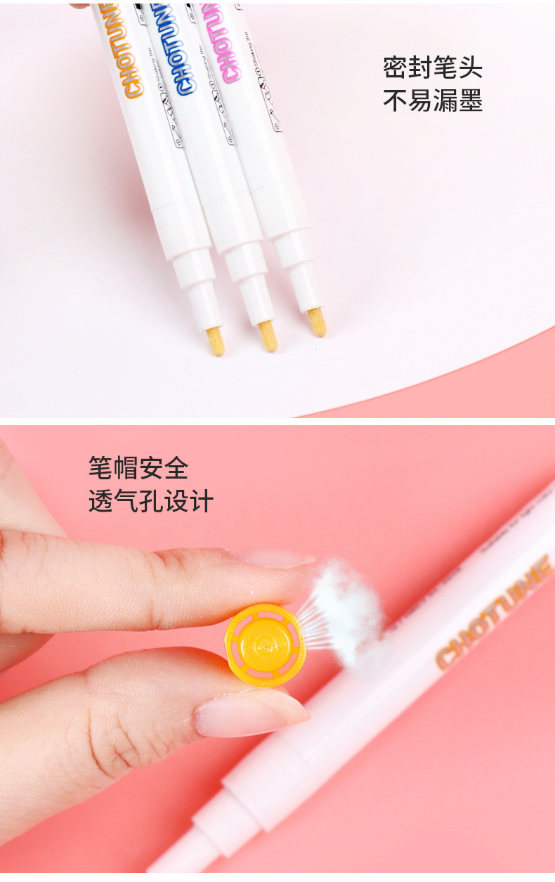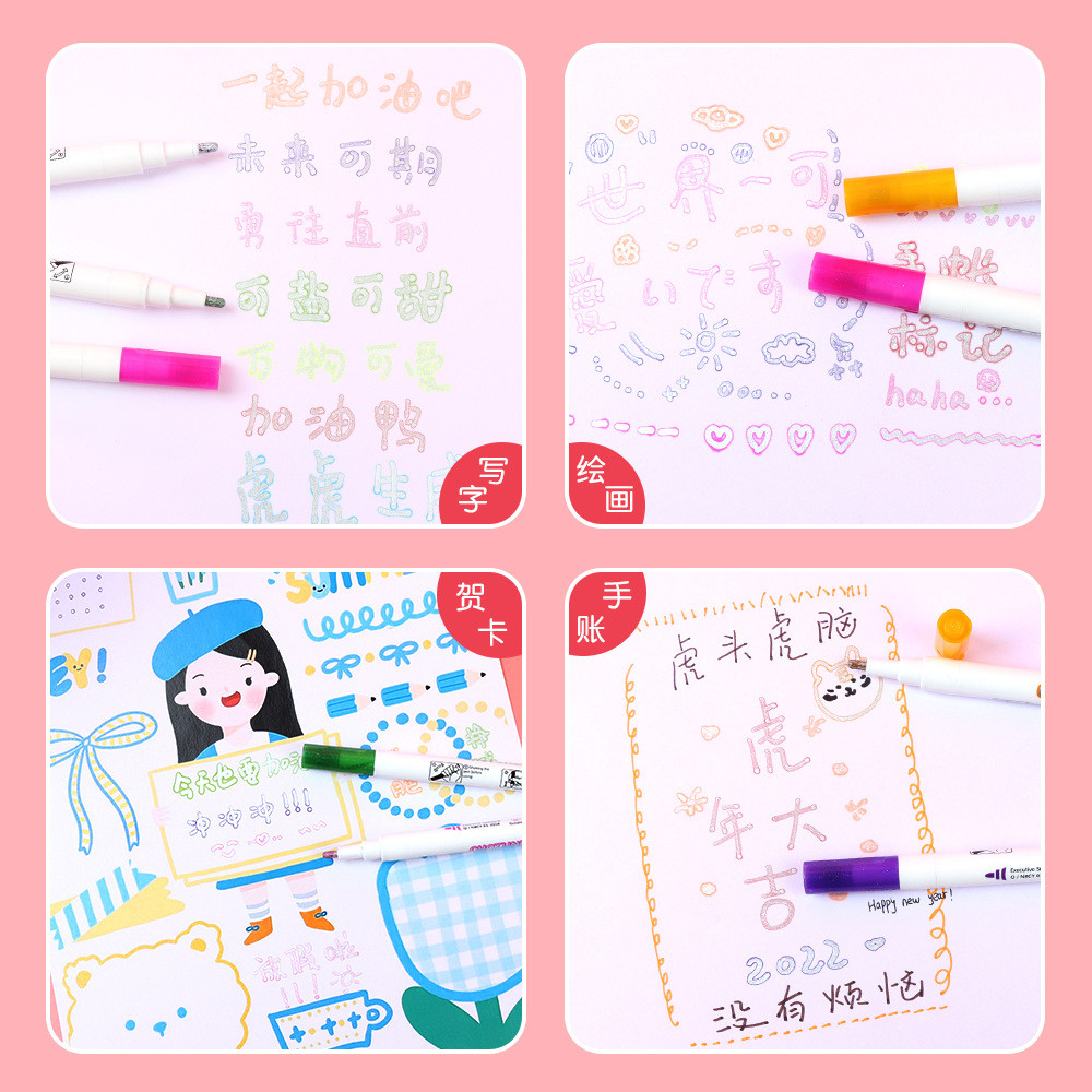 This pen can draw lines in two colors at the same time: silver and colored edges. Valve structure, alcoholic ink, quick drying, small taste. The silver line has the same coverage and firmness as a paint pen. The material of the creation must be uncoated card, cardboard, rough paper to bring the best performance. However, if painted on dark or black paper and smooth surfaces, colored edges will not appear.